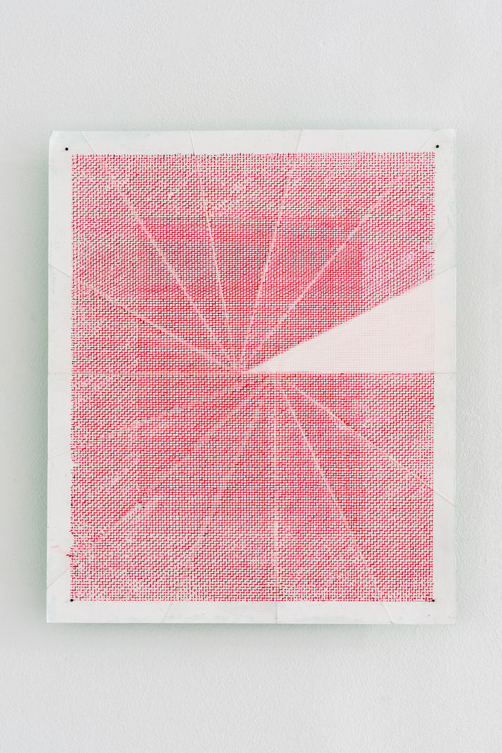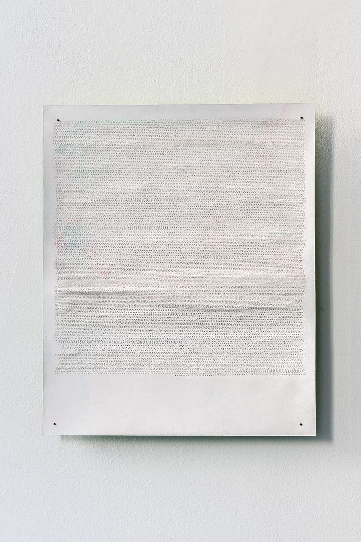 Izabel Angerer has put her training in painting aside and consciously stepped away from narrative work. Despite working without a narrative, Izabel's terror of the white sheet is unprecedented. Making traces feels very natural and gives her the opportunity to let go of control. Starting from a grid, she uses various techniques to create a rhythm in the successive actions. These actions ensure that, in addition to her own control, the limits of the paper as a carrier are also challenged. In several works, the paper has an abundance of layers. This palpable multitude of paint manipulates the carrier and acquires a vulnerability precisely where you would not expect it due to its thickness. At other times, in other works, the paper is perforated to such an extent that only a fragile sheet remains. Pores become visible, exposed. They make the paper vulnerable and invite fingers to experience their texture.
